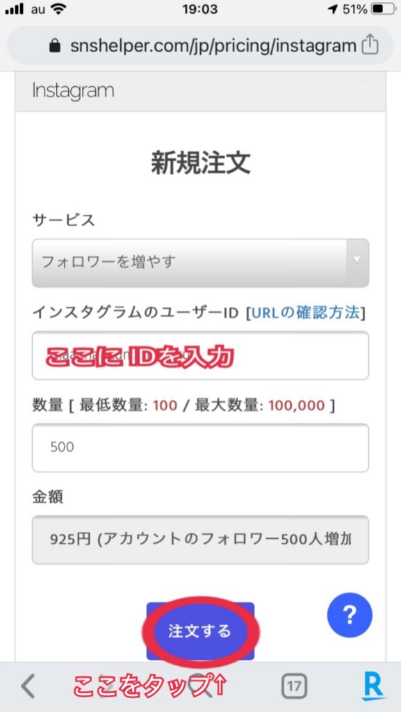 今回はフォロワー数【500人増加】を選択(925円)。925円でフォロワーが500人も増えるなら、かなりコスパがいいと思います!