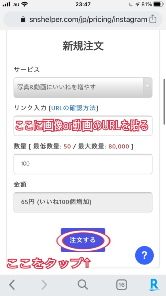今回はいいね数【100個増加】を選択(65円)。1いいね0.65円だと考えたら、コスパは悪くないんじゃないでしょうか?